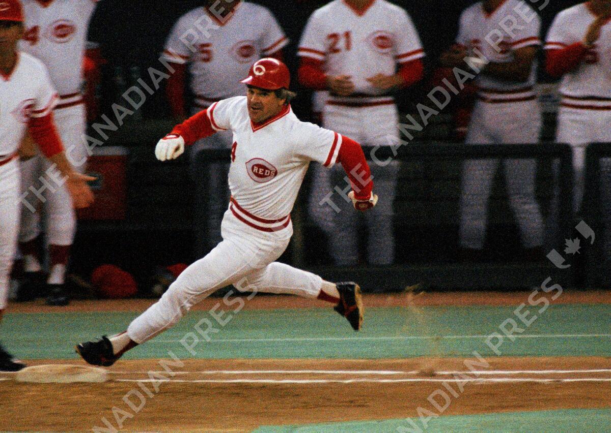 FILE - In this Sept. 11, 1985, file photo, Cincinnati Reds' Pete Rose rounds first base after hitting a single to break Ty Cobbs hitting record during a baseball game at Riverfront Stadium, Cincinnati, Ohio. The last player to be banned for life from baseball makes his living these days signing autographs. Rose has some advice for Alex Rodriguez if he wants to avoid the same fate. (AP Photo/File)