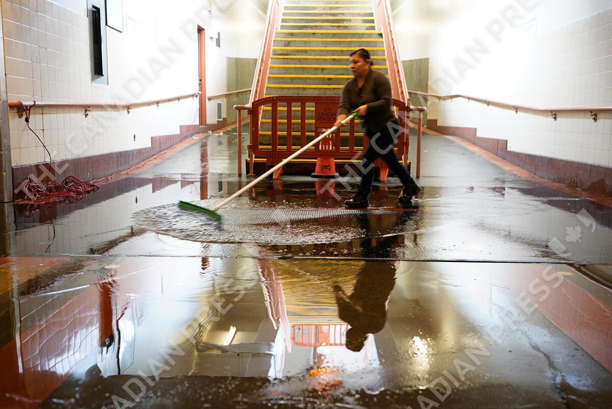 Crews work to drain rainwater flooding the Union Station's pedestrian passageway, which leads to train platforms in Los Angeles, Tuesday, Jan. 10, 2023. (AP Photo/Damian Dovarganes)