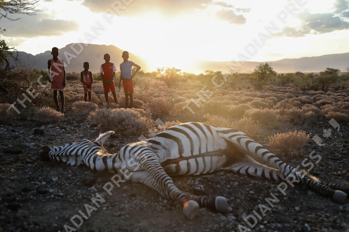 Maasai children stand beside a zebra that local residents said died due to drought, as they graze their cattle at Ilangeruani village, near Lake Magadi, in Kenya, on Wednesday, Nov. 9, 2022. Parts of Kenya have experienced four consecutive seasons with inadequate rain in the past two years, with dire effects for people and animals, including livestock. (AP Photo/Brian Inganga)
