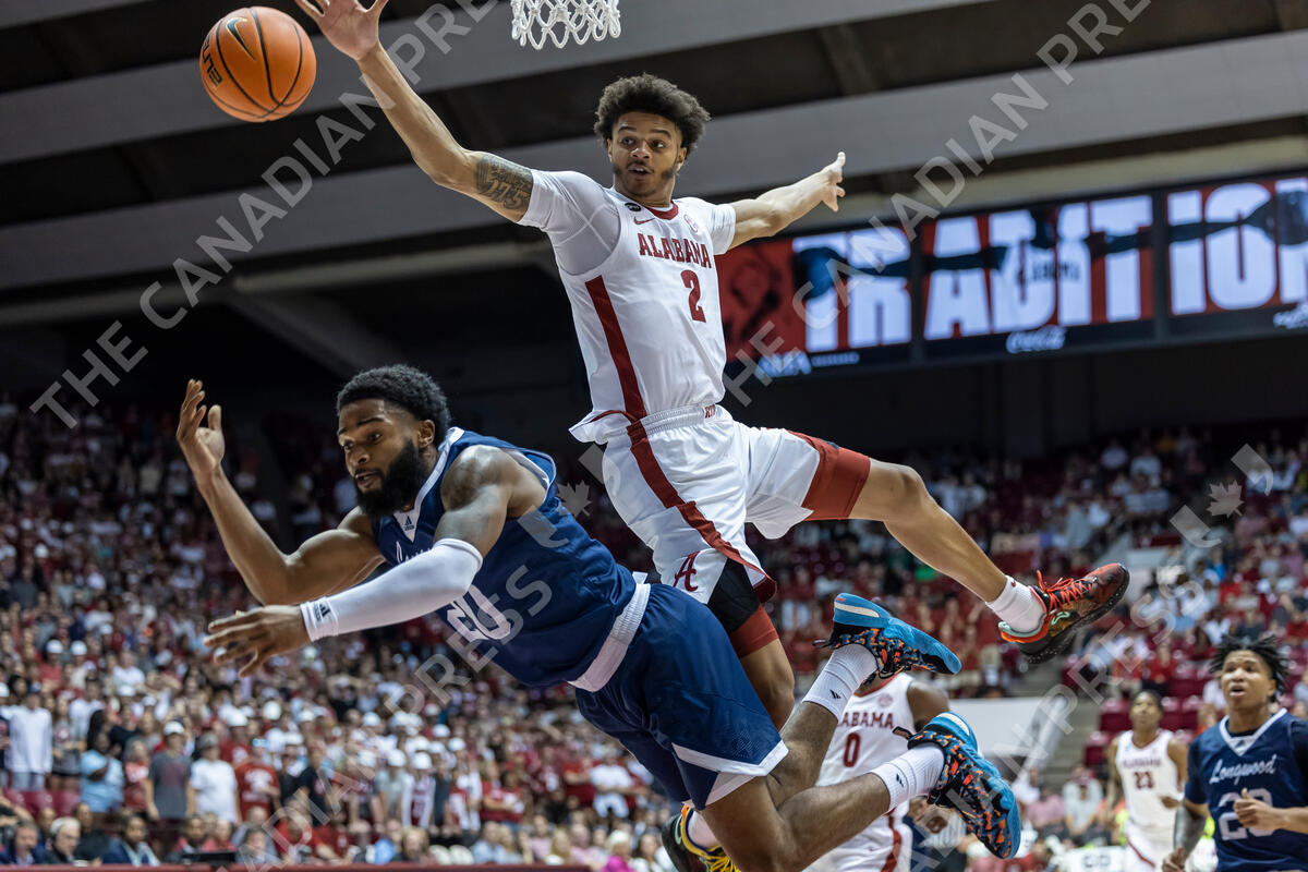 Longwood guard Walyn Napper (20) gets a shot off as Alabama forward Darius Miles (2) arrives on defense during the first half of an NCAA college basketball game Monday, Nov. 7, 2022, in Tuscaloosa, Ala. (AP Photo/Vasha Hunt)