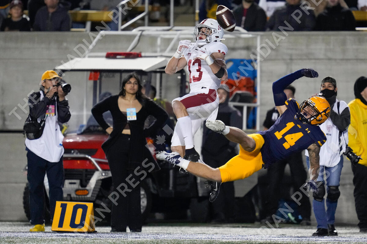 Stanford cornerback Ethan Bonner (13) is unable to catch a pass intended for California wide receiver Monroe Young (14) during the second half of an NCAA college football game in Berkeley, Calif., Saturday, Nov. 19, 2022. (AP Photo/Godofredo A. Vásquez)