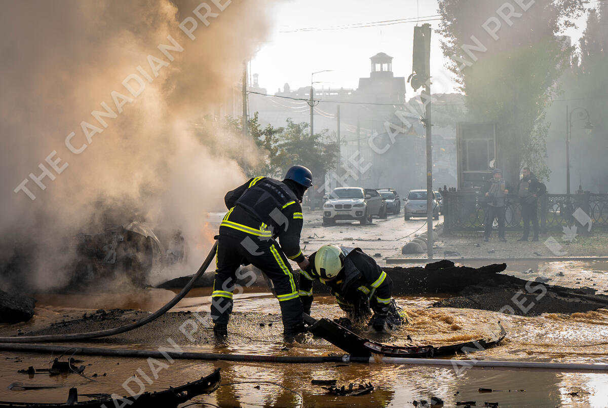 A firefighter helps his colleague to escape from a crater as they extinguish smoke from a burned car after a Russian attack in Kyiv, Ukraine, Monday, Oct. 10, 2022. Russia unleashed a lethal barrage of strikes against multiple Ukrainian cities Monday, smashing civilian targets including downtown Kyiv where at least six people were killed amid burnt-out cars and shattered buildings. The onslaught brought back into focus the grim reality of war after months of easing tensions in the capital. (AP Photo/Roman Hrytsyna)