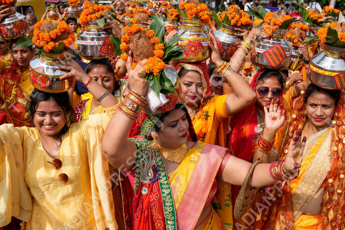 Hindu women carry water from River Ganges on their heads and walk in a procession as they perform a ritual in Prayagraj, northern Uttar Pradesh state, India, Monday, Oct. 10, 2022. (AP Photo/Rajesh Kumar Singh)