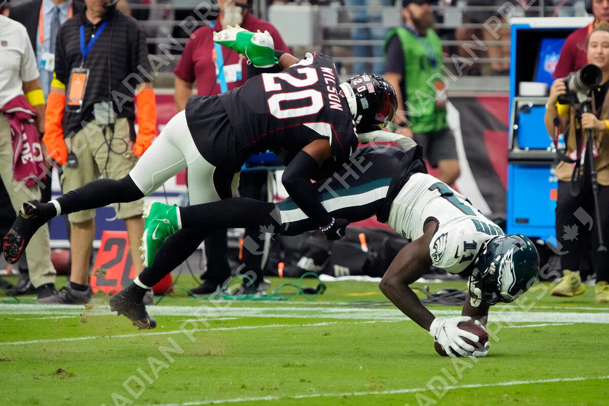 Arizona Cardinals cornerback Marco Wilson (20) tackles Philadelphia Eagles wide receiver A.J. Brown (11) during the first half an NFL football game, Sunday, Oct. 9, 2022, in Glendale, Ariz. (AP Photo/Rick Scuteri)