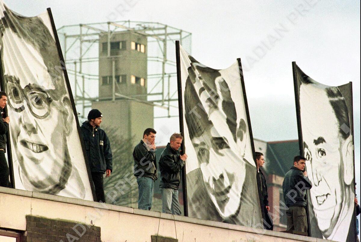 File - Protestors hold banners showing portraits of three of the thirteen killed on Bloody Sunday, against a backdrop of a security tower in this Sunday, Feb. 1, 1998 file photo, in Londonderry, Northern Ireland. The rally was held to honor the Irish demonstrators killed during a civil rights march in 1972. Chief Constable Matt Baggott told Northern Ireland’s policing board Thursday July 5 2012 that his force is planning a Bloody Sunday investigation that would require 30 detectives and take four years. Northern Ireland’s police commander says his detectives will eventually investigate the Bloody Sunday massacre to determine whether any British soldiers should be charged with murder _ but not yet. Families of the 13 people killed when troops opened fire on Irish Catholic demonstrators in 1972 have waited for a criminal investigation to start since 2010, when the biggest fact-finding probe in British history determined that the soldiers targeted unarmed civilians. (AP Photo/Paul McErlane, File)