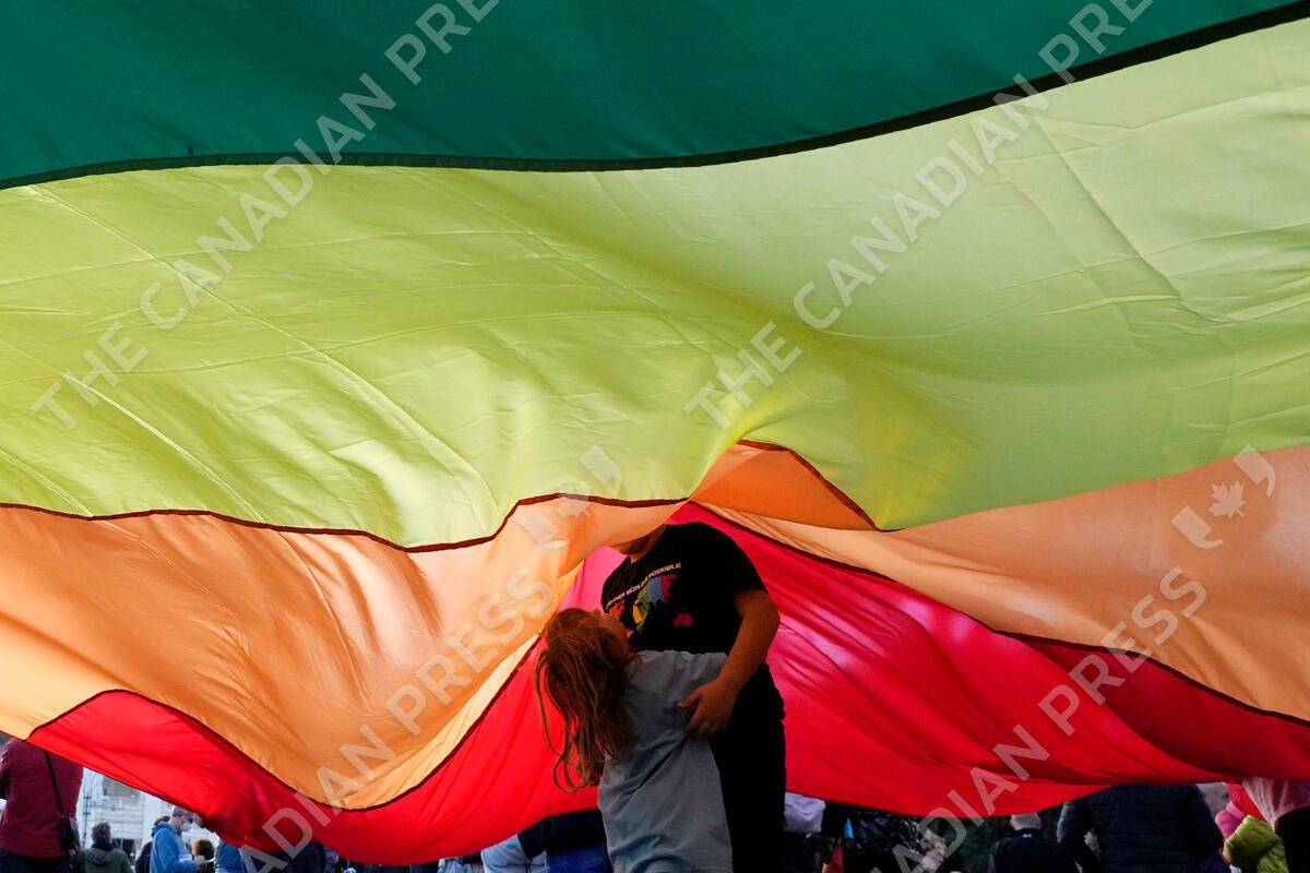 Children play under a big flag during a peace rally against war attended by different organizations including Democratic Party and 5-Star Movement in Rome, Saturday, Nov. 5, 2022. (AP Photo/Gregorio Borgia)