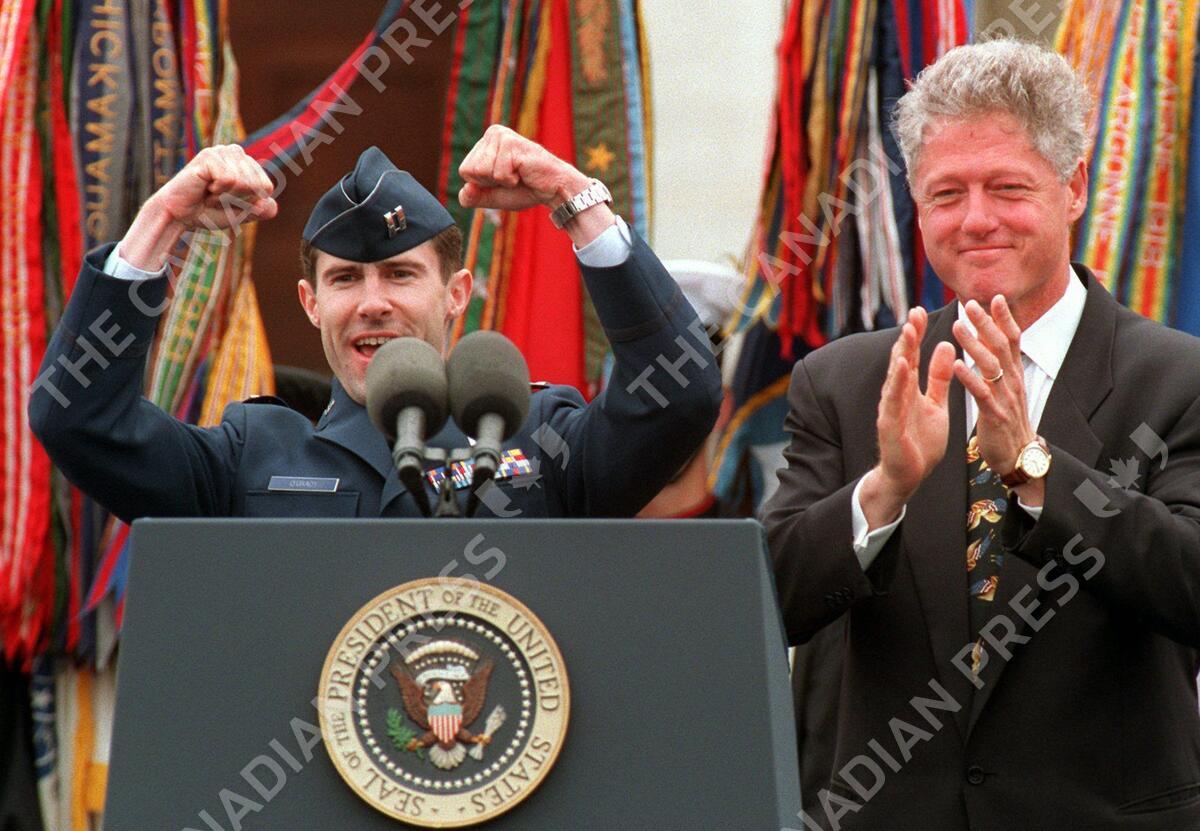 FILE - In this June 12, 1995 file photo, President Bill Clinton applauds as Air Force pilot Scott O'Grady gestures during a welcome home ceremony for O'Grady at the Pentagon. (AP Photo/J.Scott Applewhite, FILE)