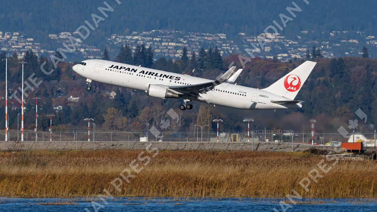 A Japan Airlines Boeing 767 jetliner (JA607J) departs Vancouver International Airport, Richmond, B.C., on Thursday, November 17, 2022. THE CANADIAN PRESS IMAGES/Bayne Stanley