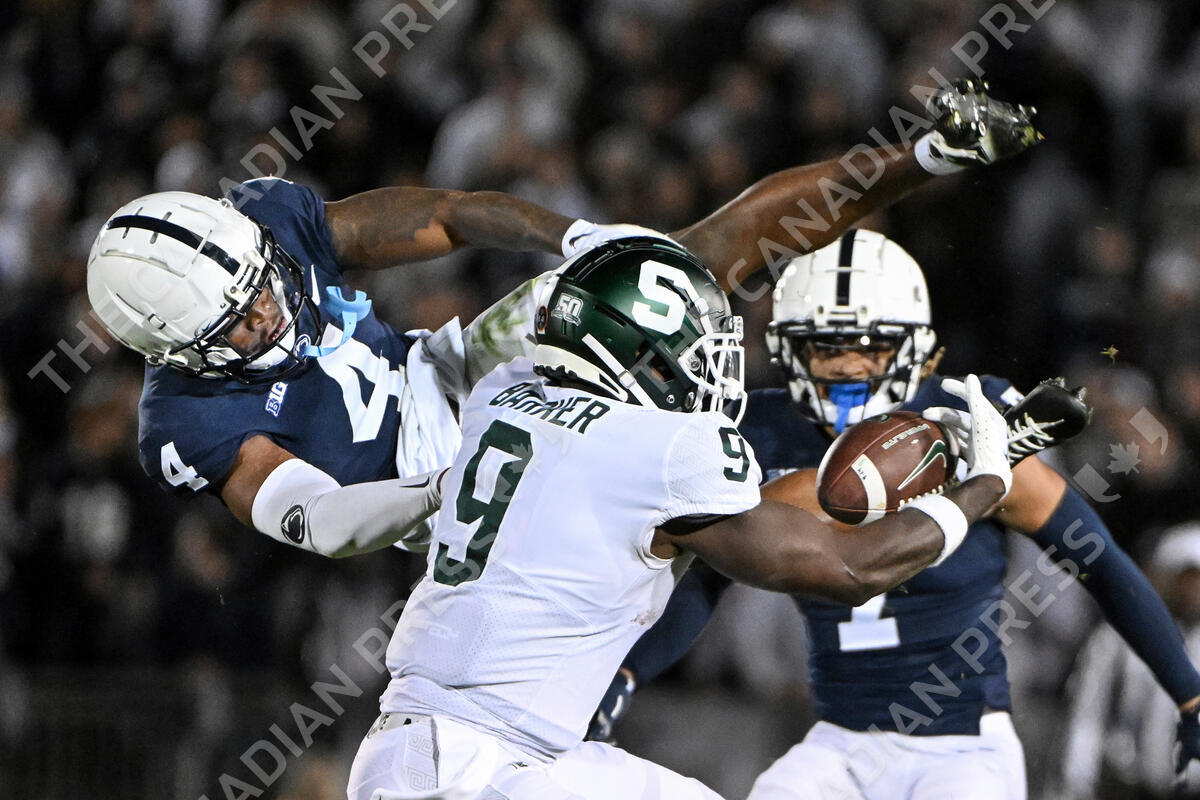 Penn State cornerback Kalen King (4) breaks up a pass intended for Michigan State tight end Daniel Barker (9) during the first half of an NCAA college football game, Saturday, Nov. 26, 2022, in State College, Pa. (AP Photo/Barry Reeger)