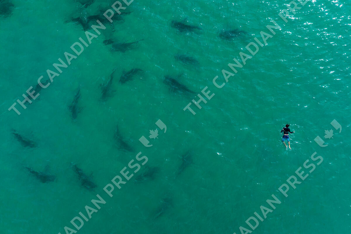 Sandbar sharks swim next to a snorkler in the Mediterranean Sea near a power plant off the coast of Hadera, Israel, Monday, Nov. 21, 2022. The hot water gushing from an industrial plant in Israel's northern city of Hadera draws these sharks that are not considered to be dangerous to people, but are increasingly endangered by overfishing. (AP Photo/Oded Balilty)