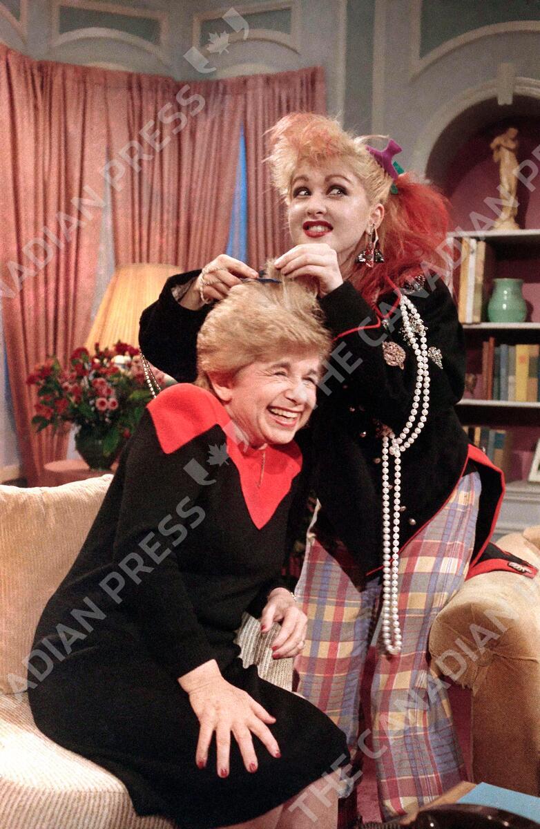 FILE - In this Jan. 17, 1985 file photo, sex therapist Dr. Ruth Westheimer laughs as musician Cyndi Lauper does her hair up in "punk" style in New York. In 1980, Westheimer broke into late-night radio with "Sexually Speaking," launching a career as confider-in-chief. The voice that Westheimer found on radio, and in the books and television shows that followed, pushed the boundaries of popular culture, declaring it not just safe, but healthy, for people to speak explicitly about their sex lives. A generation after the country embraced the Ruthian ethic of sexual honesty and moved on, what's left for Dr. Ruth, now an octogenarian grandmother, to talk about? Plenty, as it turns out. (AP Photo/Nancy Kaye)