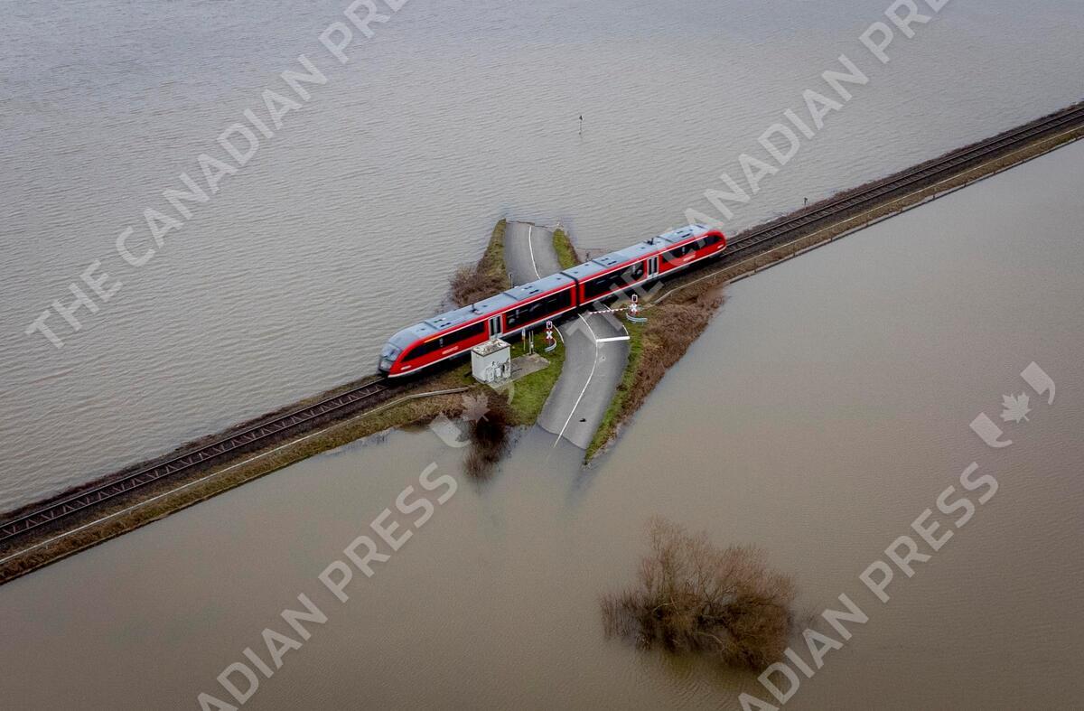 A regional train approaches passes a railroad crossing between flooded fields in Nidderau-Eichen near Frankfurt, Germany, Monday, Jan. 16, 2023. (AP Photo/Michael Probst)