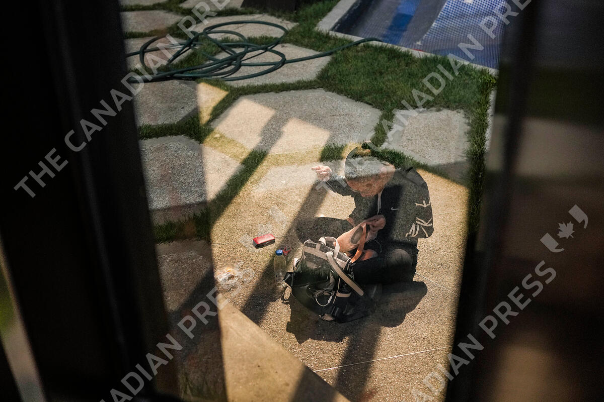 A dancer mends her ballet shoe before the start of a Nutcracker rehearsal, at the Teresa Carreno Theater in Caracas, Venezuela, Wednesday, Dec. 7, 2022. (AP Photo/Matias Delacroix)