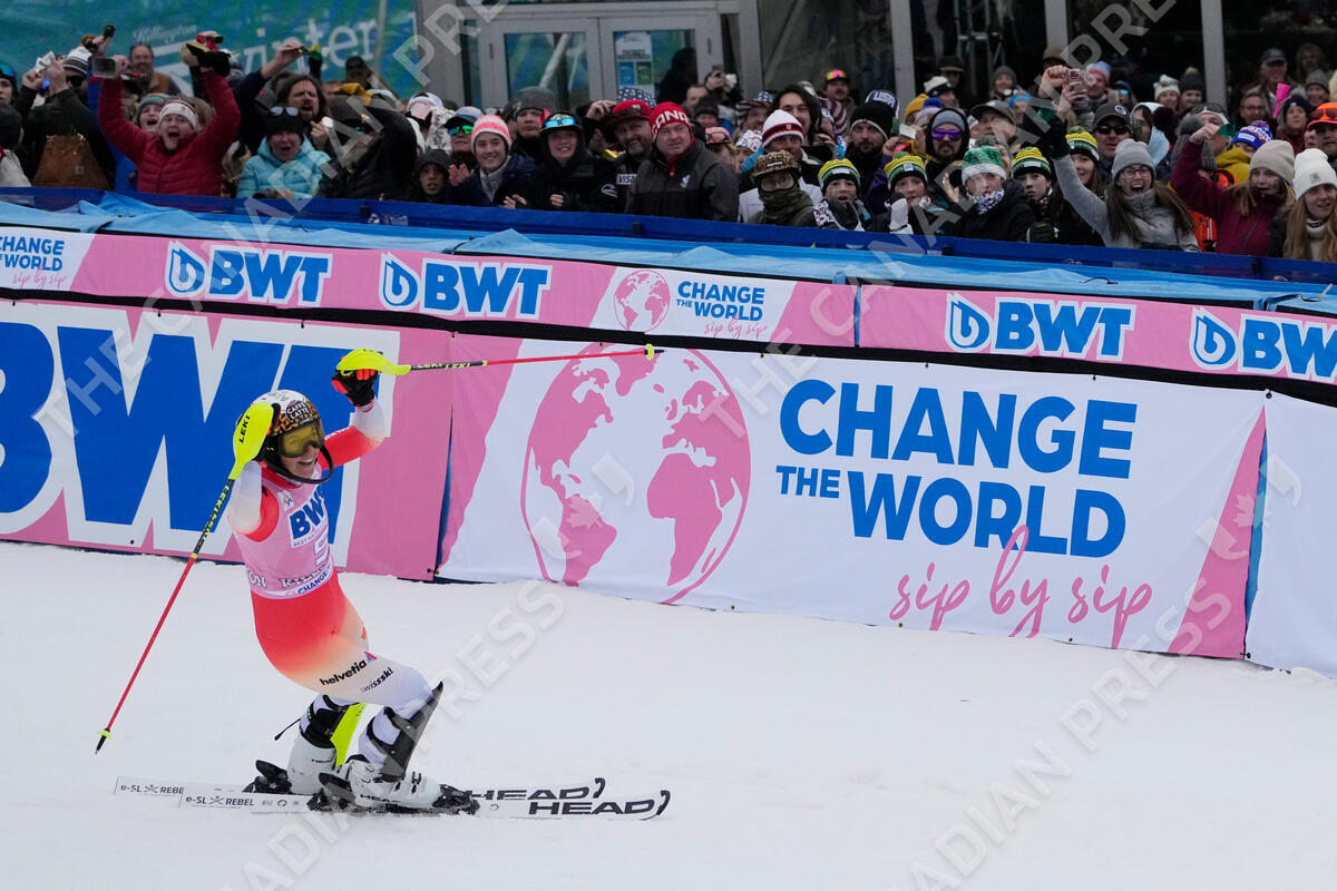 Switzerland's Wendy Holdener reacts after her second run in a World Cup slalom skiing race Sunday, Nov. 27, 2022, in Killington, Vt. (AP Photo/Robert F. Bukaty)