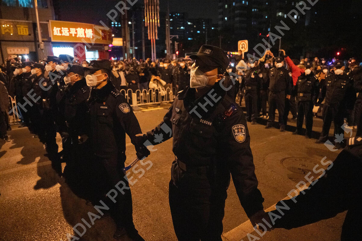 Chinese policemen form a line to stop protesters marching in Beijing, Sunday, Nov. 27, 2022. Protesters angered by strict anti-virus measures called for China's powerful leader to resign, an unprecedented rebuke as authorities in at least eight cities struggled to suppress demonstrations Sunday that represent a rare direct challenge to the ruling Communist Party. (AP Photo/Ng Han Guan)