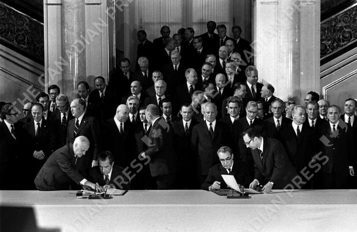 President Richard Nixon and Soviet Communist Party leader Leonid Brezhnev afix their signatures to the Strategic Arms Limitations agreement in Vladmir Hall of the Kremlin, Moscow, in this May 26, 1972, photo. President Bush now says is past its time. (AP Photo/File)