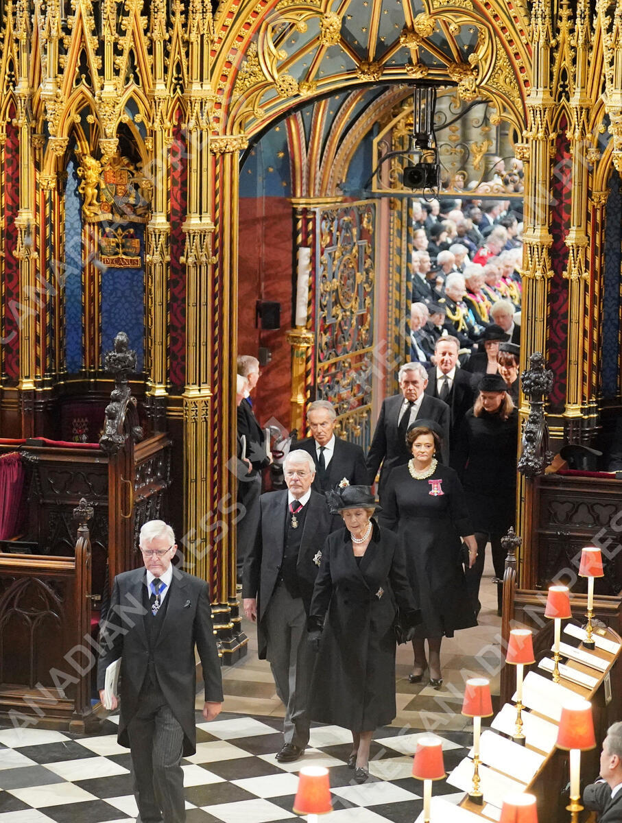 Former British prime ministers John Major and his wife Norma Major, Tony Blair and his wife Cherie Blair, Gordon Brown and his wife Sarah Brown, David Cameron and his wife Samanatha Cameron arrive for the funeral service of Queen Elizabeth II at Westminster Abbey in central London, Monday Sept. 19, 2022. The Queen, who died aged 96 on Sept. 8, will be buried at Windsor alongside her late husband, Prince Philip, who died last year. (Dominic Lipinski/Pool via AP)