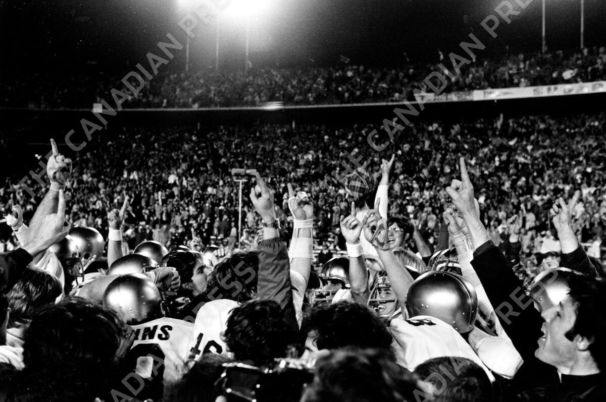 FILE - In this Dec. 31, 1973, file photo, Notre Dame players team point their fingers skyward as they chant "we're number one" after defeating then-undefeated Alabama 24-23 in the Sugar Bowl NCAA college football game in New Orleans. Alabama (11-1) finished the regular season undefeated and was declared the national champion in the coaches poll, where the Irish were ranked No. 4. Notre Dame (11-0) then defeated Alabama in the Sugar Bowl and AP named Notre Dame the national champion. (AP Photo/File)