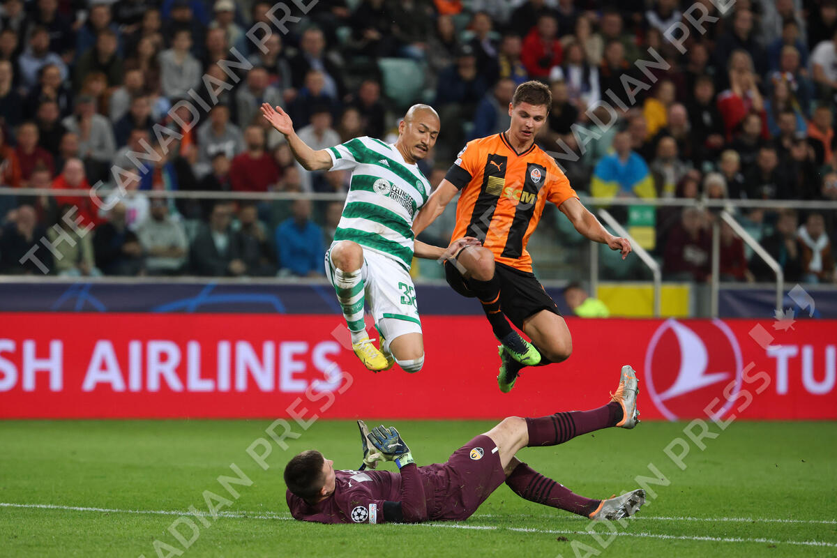 Celtic's Daizen Maeda, left, and Shakhtar's Valeriy Bondar jump over Shakhtar's goalkeeper Oleksiy Shevchenko during a Champions League group F soccer match between Shakhtar Donetsk and Celtic at Wojska Polskiego stadium, in Warsaw, Poland, Wednesday Sept. 14, 2022. (AP Photo/Michal Dyjuk)