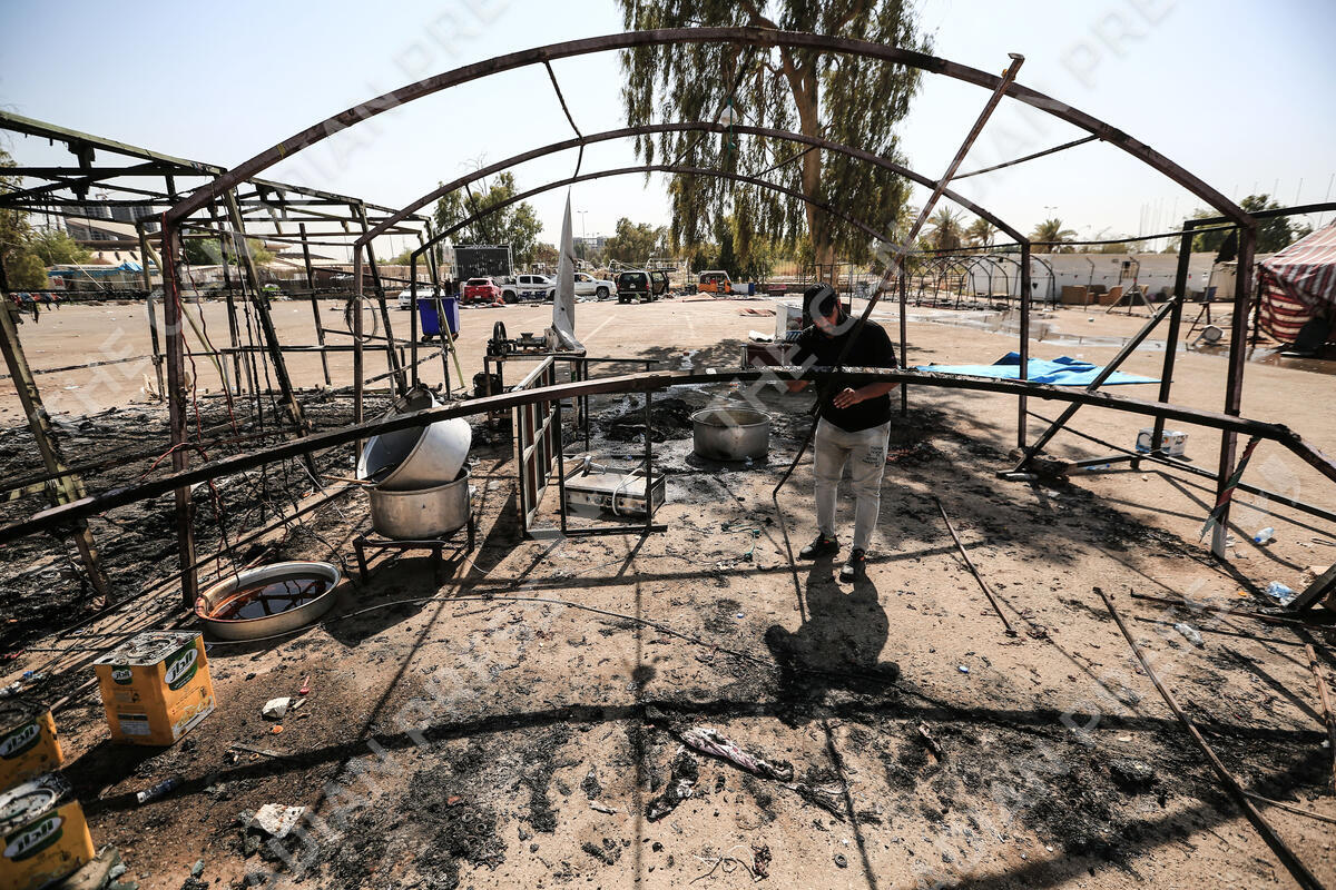 30 August 2022, Iraq, Baghdad: AåÊsupporter of Iraqi influential Shiite cleric Muqtada Al-Sadr, dismantles an encampment near the parliament building inside Baghdad's Green Zone, as Shiite protesters withdraw from their protest site. Moqtada al-Sadr ordered his followers to withdraw from their protest site in Baghdad on Tuesday after deadly clashes left at least 25 dead. (Credit Image: © Ameer Al-Mohammedawi/dpa via ZUMA Press)