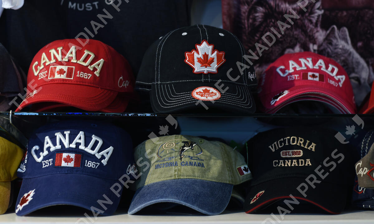 Souvenir Canada baseball caps are displayed for sale in a tourist gift shop in downtown Victoria, British Columbia on August 26, 2022. THE CANADIAN PRESS IMAGES/Don Denton
