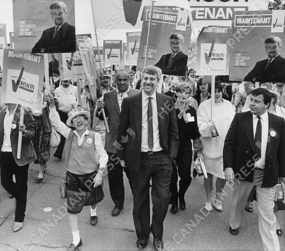 Quebec Justice Minister Pierre Marc Johnson arrives with his supporters at Laval University in Quebec on Sept. 22, 1985. The Canadian Press/Jacques Nadeau