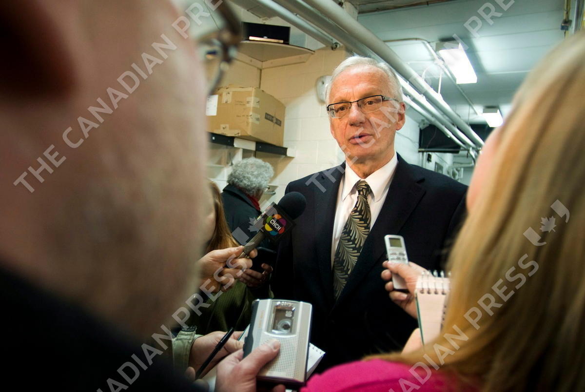 Hamilton Mayor Bob Bratina talks to the media following a press conference at Ivor Wynne Stadium in Hamilton, Ont., Tuesday, January 11, 2011. Bratina and Hamilton Tiger-Cats owner Bob Young have ended their standoff over a new stadium.The two have announced a proposal for a renovated stadium to be constructed where Ivor Wynne currently stands. THE CANADIAN PRESS/John Rennison