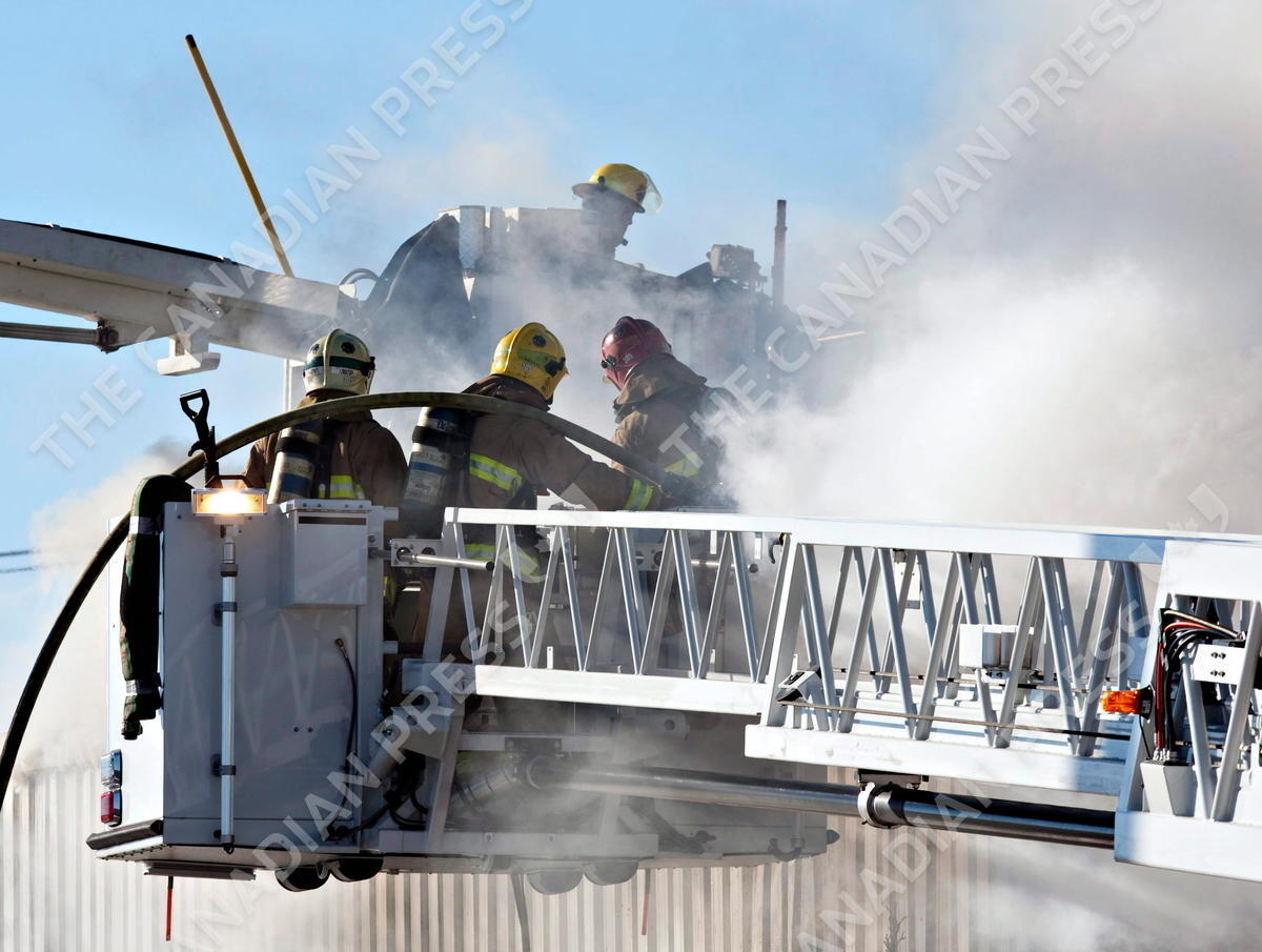 Firefighters work on a three-alarm fire at a concrete plant Tuesday, January 11, 2011 in Saint-Augustin-de-Desmaures, Que. A plume of smoke was visible tens of kilometres away from the blaze.. THE CANADIAN PRESS/Jacques Boissinot