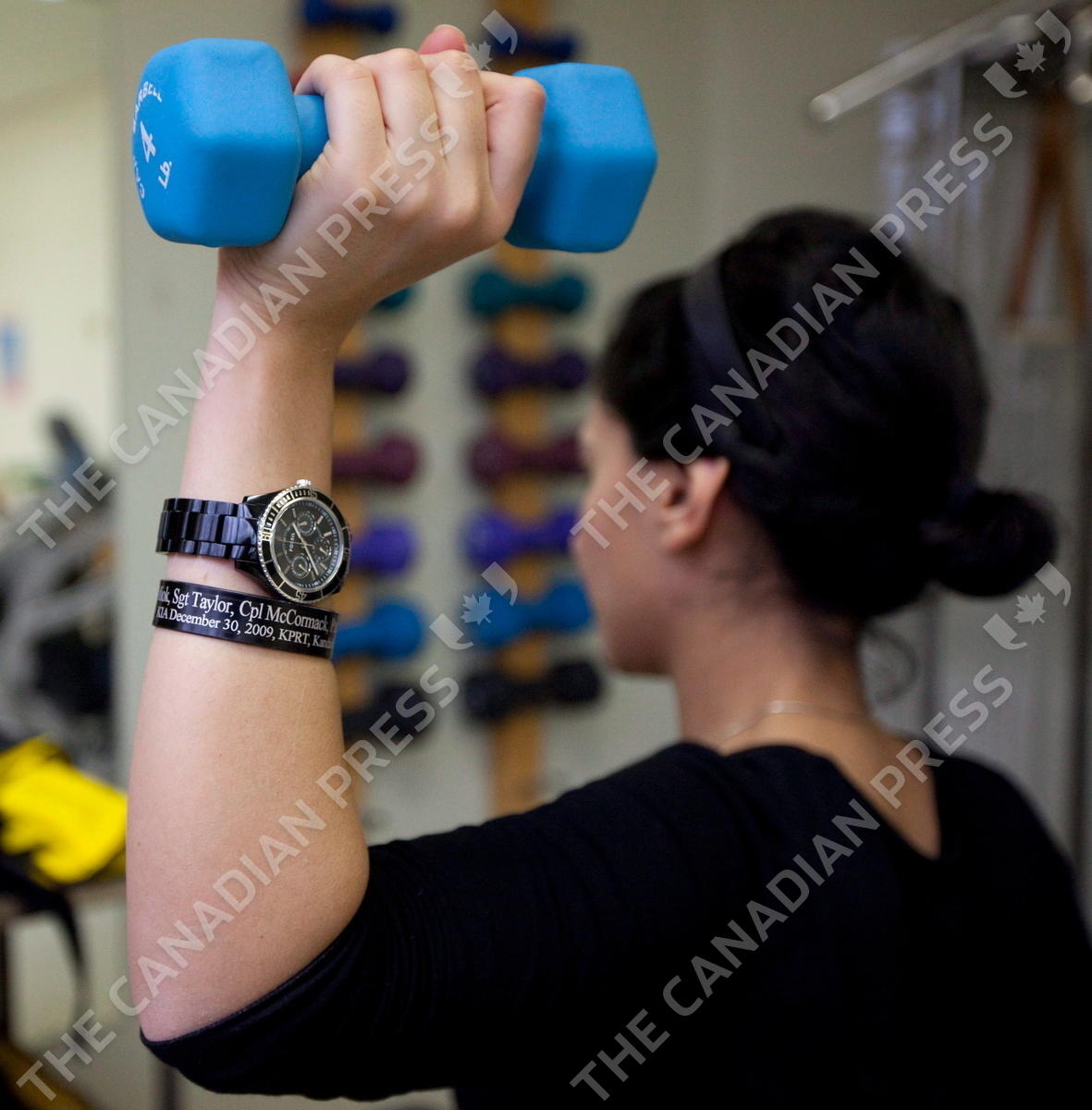 Bushra Saeed works through her daily physiotherapy routine at the Rehabilitation Centre in Ottawa on Thursday Dec. 2, 2010. Bushra wears a bracelet with the names of those lost in the bombing. THE CANADIAN PRESS/Sean Kilpatrick