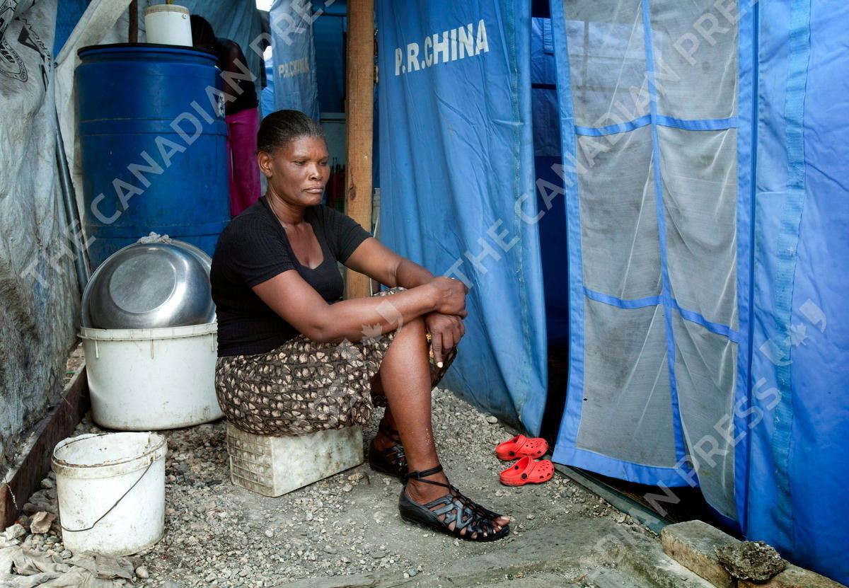 Vedette Guillaume sits outside her tent in a displaced person camp in the Champ-de Mars district of Port-au-Prince, Haiti, Friday, December 10, 2010. A year after an earthquake pummeled Haiti, more than a million people still live amid the squalor and violence of the country's sprawling tent cities. THE CANADIAN PRESS/Paul Chiasson