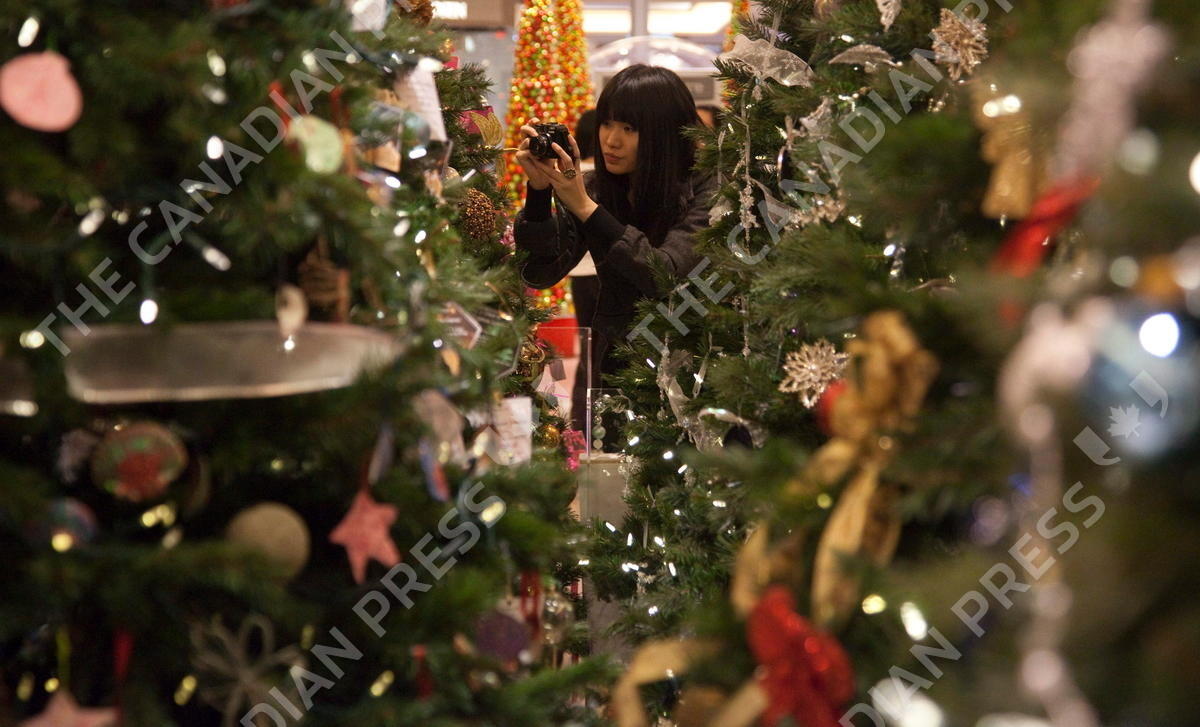 Framed by Christmas trees a shopper takes a moment to take a photograph at a downtown Vancouver mall Wednesday, Dec 22, 2010. THE CANADIAN PRESS/Jonathan Hayward