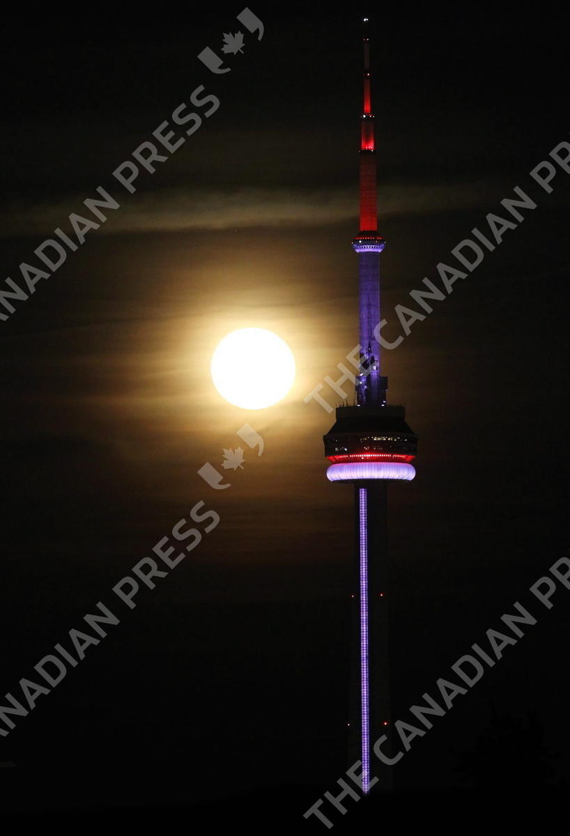 The moon is seen through clouds behind the CN Tower in Toronto Friday, May 28, 2010. THE CANADIAN PRESS/Darren Calabrese