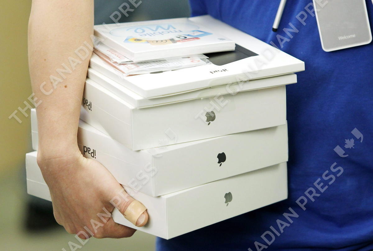 An Apple employee carries a stack of iPads at an Apple store in Toronto Friday, May 28, 2010. THE CANADIAN PRESS/Darren Calabrese