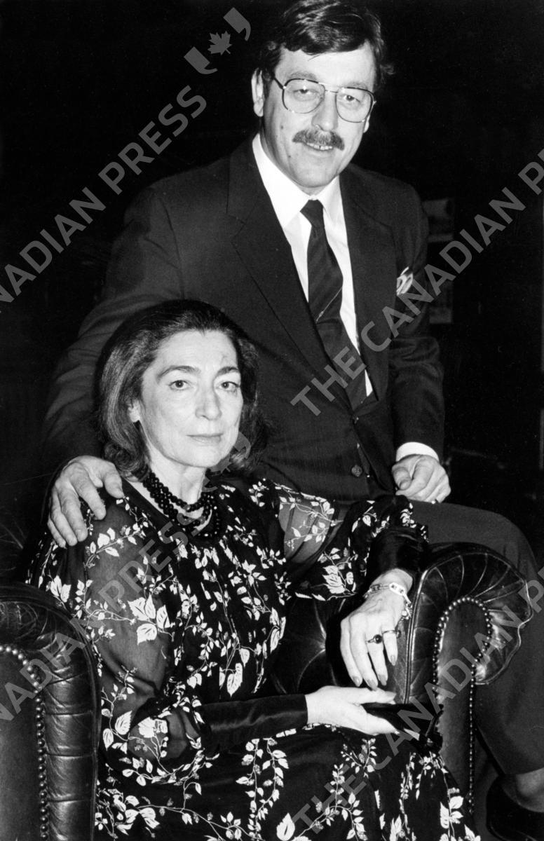 Jacqueline Picaso, wife of the late Pablo Picasso, sits next to her friend PQ Cultural Affairs Minister Clemont Richard before an exhibition of Pablo's work in Montreal on June 16, 1985. The Canadian Press/Robert Lee