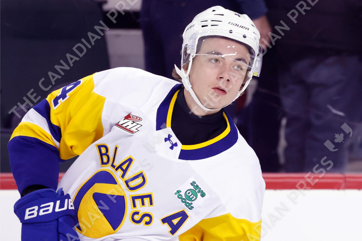 Profile photo on Saskatoon Blades D Brayden Klimpke during WHL (Western Hockey League) hockey against the Calgary Hitmen in Calgary, Alta., Nov. 14, 2025. THE CANADIAN PRESS IMAGES/Larry MacDougal