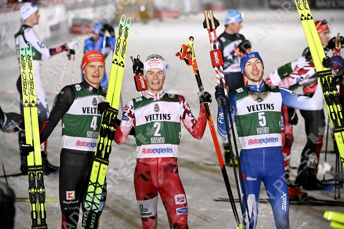 First placed Johannes Lamparter of Austria (C), second placed Julian Schmid of Germany (L) and third placed Ilkka Herola of Finland compete during 7,5 km Cross-Country Skiing of Nordic Combined Individual Compact at the FIS World Cup Ruka Nordic in Kuusamo, Finland on November 28, 2025. LEHTIKUVA / RONI REKOMAA - FINLAND OUT. NO THIRD PARTY SALES.
