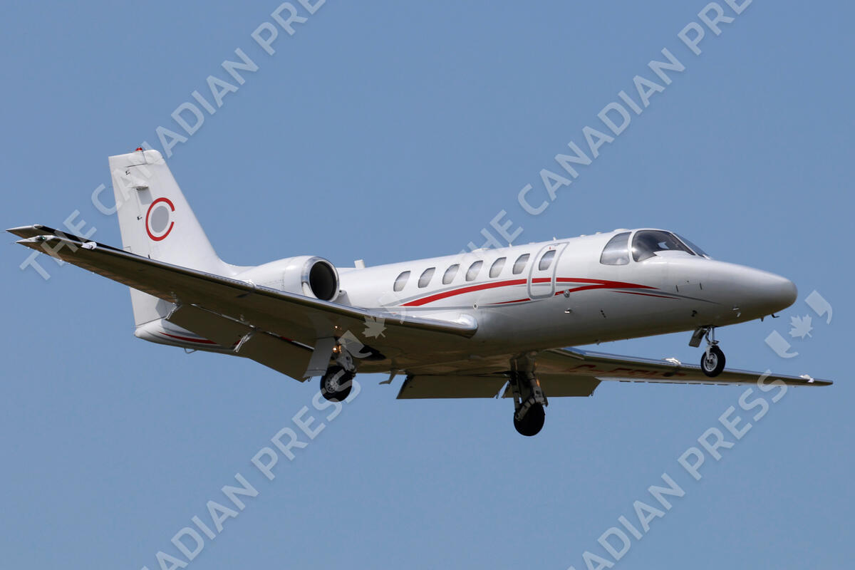 A Cessna Citation Encore (Cessna 560, registration C-FSNC) jet, owned by Chartright Air, lands at Lester B. Pearson International Airport near Toronto, Ontario, Sept. 17, 2025. THE CANADIAN PRESS IMAGES/Larry MacDougal