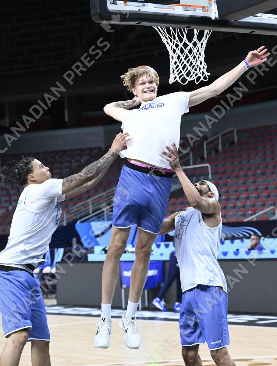 Miro Little, Miikka Muurinen and Jacob Grandison during practice session of team Finland at the FIBA Eurobasket 2025 tournament in Riga, Latvia on September 11, 2025. LEHTIKUVA / HEIKKI SAUKKOMAA - FINLAND OUT. NO THIRD PARTY SALES.