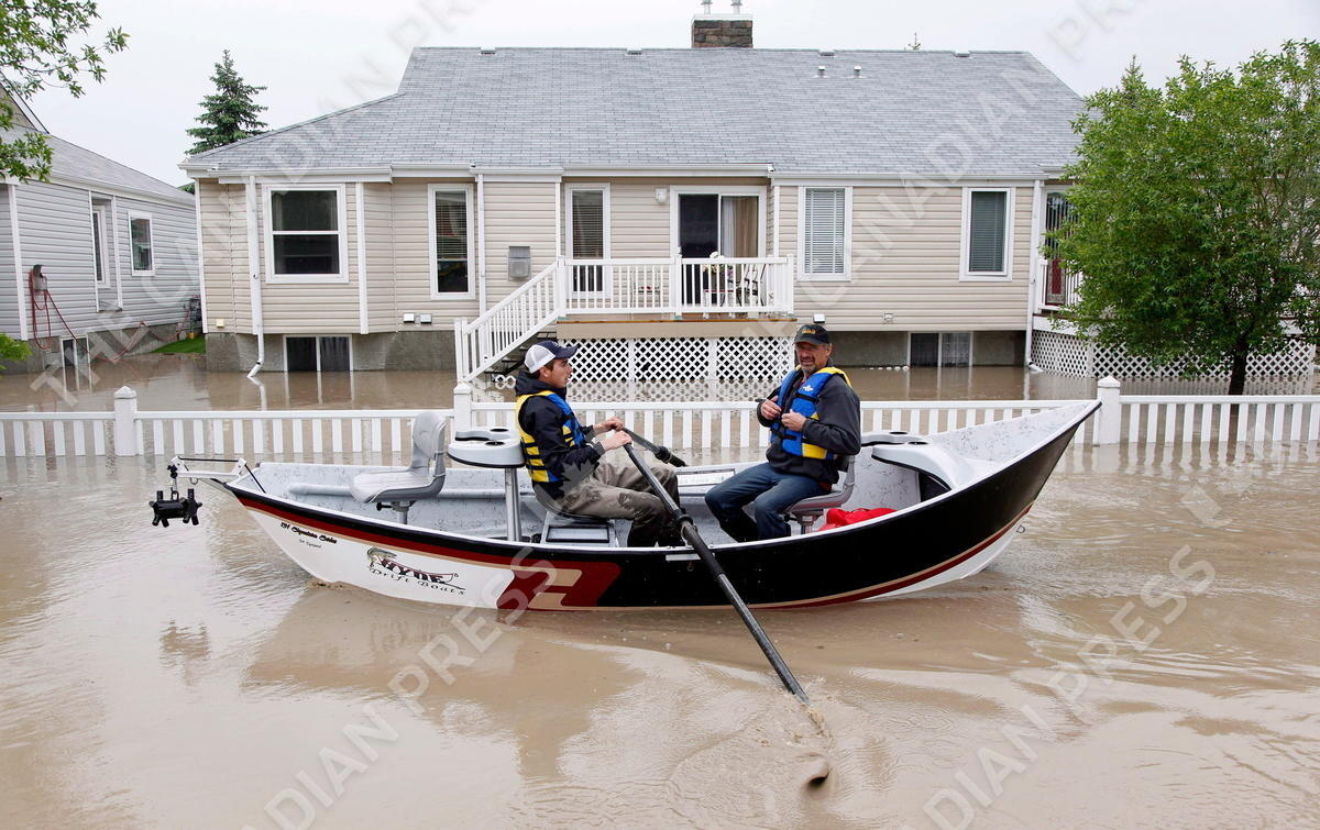 Two men use a fishing boat to rescue residents from a neighborhood after heavy rains caused flooding, closed roads, and forced evacuation in High River, Alta., Thursday, June 20, 2013.THE CANADIAN PRESS/Jeff McIntosh