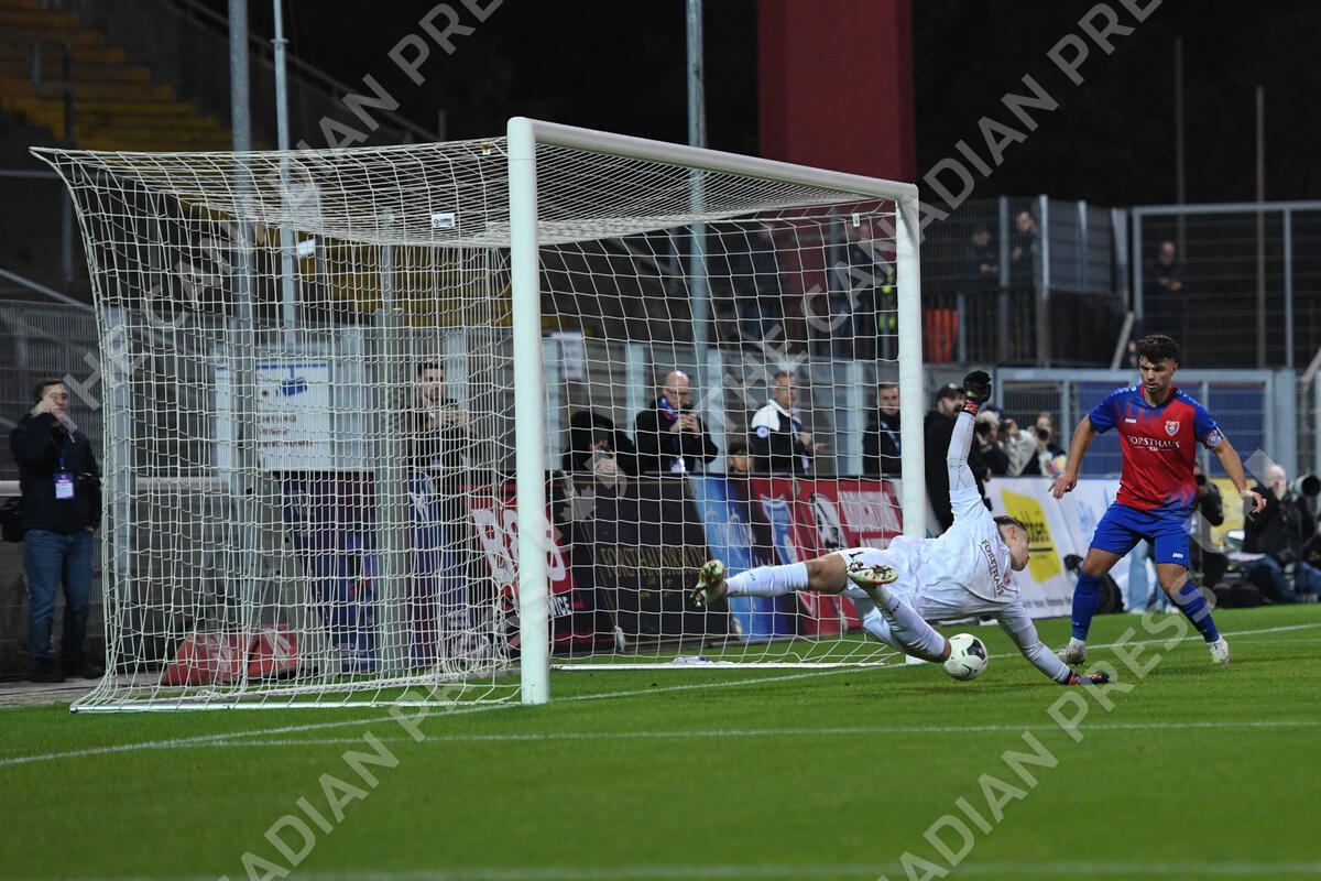 Fußball Niederrheinpokal Achtelfinale KFC Uerdingen 05 - MSV Duisburg am 15.10.2025 im Grotenburg-Stadion in Krefeld Tor zum 0:1 durch Joshua Bitter Duisburg *** Soccer Niederrheinpokal Round of 16 KFC Uerdingen 05 MSV Duisburg on 15 10 2025 at Grotenburg Stadium in Krefeld Goal to 0 1 by Joshua Bitter Duisburg xRx