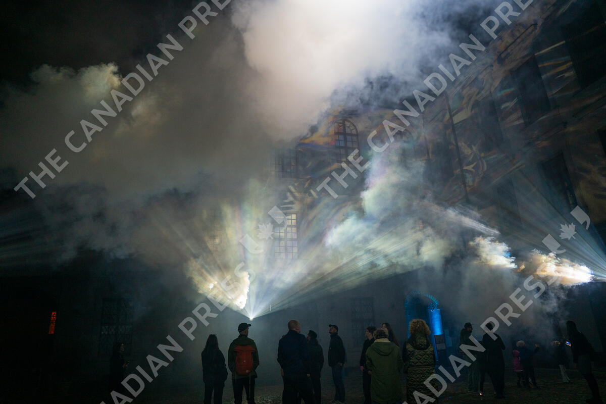 PRAGUE, Oct. 17, 2025 Visitors watch a projection of video mapping during the Signal Festival in Prague, the Czech Republic, Oct. 17, 2025. The streets and historic landmarks of Prague have once again come alive with light and digital art as the 13th edition of the Signal Festival opened on Thursday evening. (Credit Image: © Da Nuo¡¤Keshennailuowa/Xinhua via ZUMA Press)