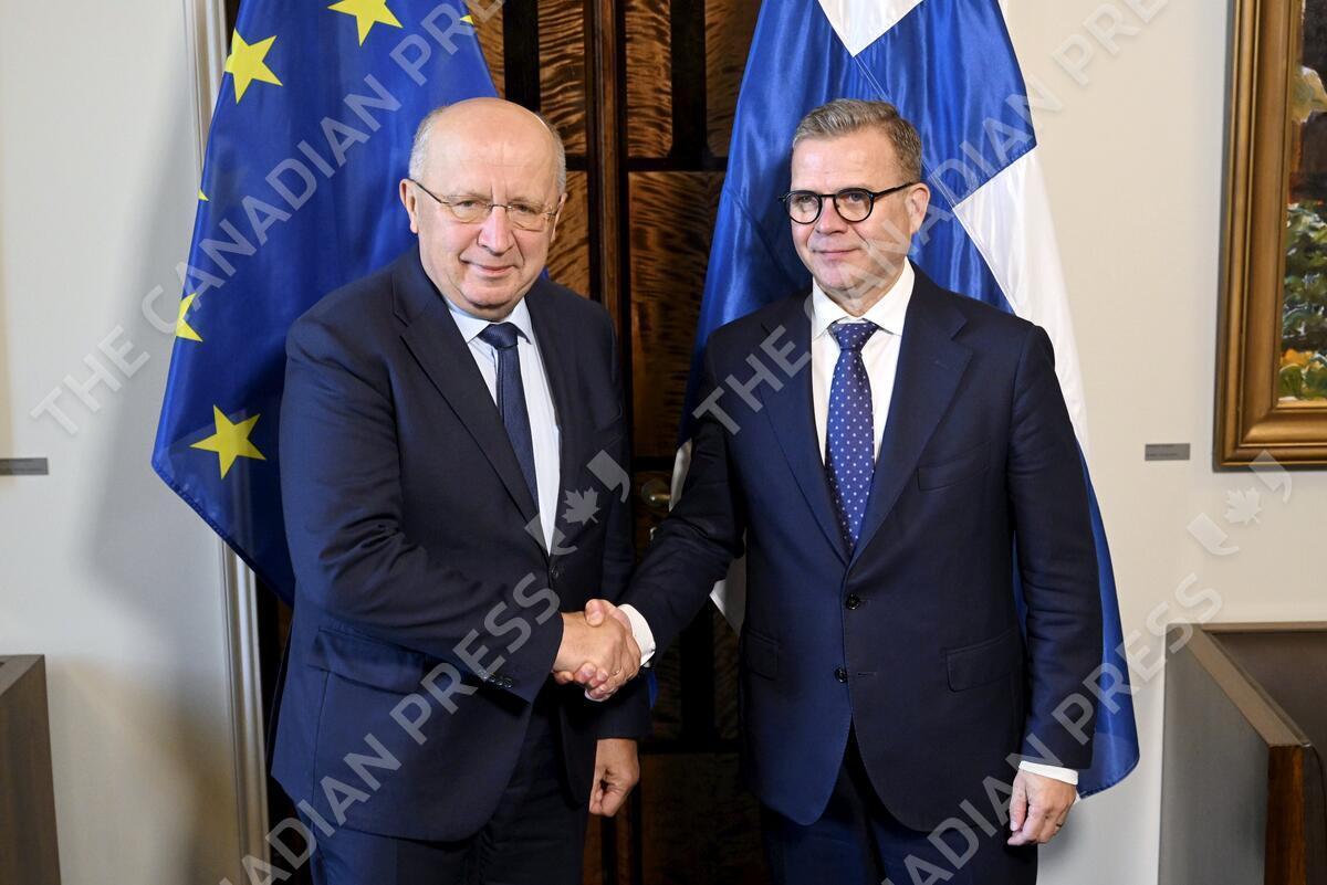 EU Commissioner for Defence and Space, Lithuanian Andrius Kubilius (L) and Finnish Prime Minister Petteri Orpo shake hands before their meeting at the Finnish Parliament in Helsinki, Finland on September 26, 2025. One of the main topics of their meeting is the proposed 'drone wall' to be assigned to protect EU's Russian border. LEHTIKUVA / VESA MOILANEN - FINLAND OUT. NO THIRD PARTY SALES.