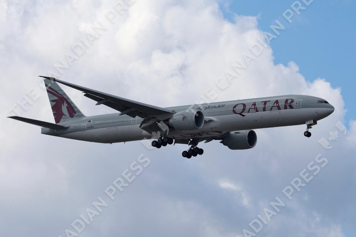 A Boeng 777 (777-300ER) jetliner, owned by Qatar Airways, lands at Lester B. Pearson International Airport near Toronto, Ontario, Sept. 14, 2025. THE CANADIAN PRESS IMAGES/Larry MacDougal