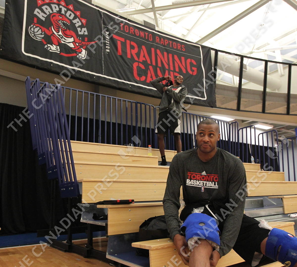 Toronto Raptors' Jamaal Magloire ices his knees after completing drills during training camp in Halifax, N.S. on Wednesday Oct. 3, 2012. The Raptors will open their pre-season with a game versus Spanish professional basketball team Real Madrid on October 8, 2012 in Toronto. THE CANADIAN PRESS/Mike Dembeck.