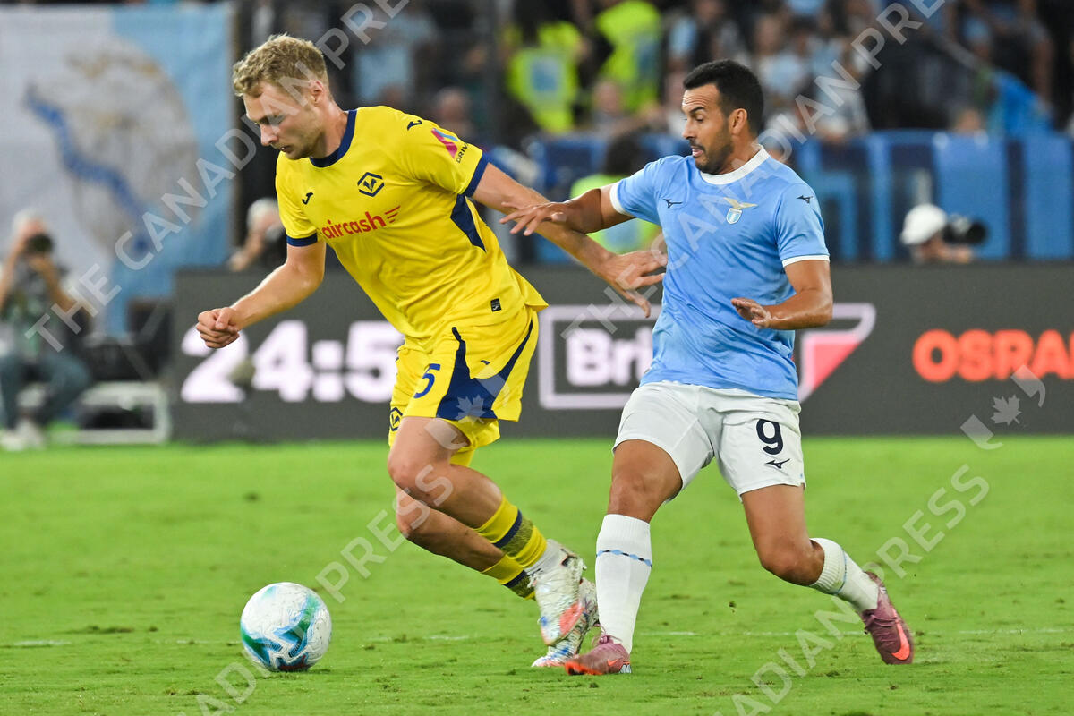 Victor Nelsson of Hellas Verona,Pedro Rodriguez of SS Lazio during the serie A Enilive match between SS Lazio v Hellas Verona at olimpico stadium in Rome Mattia Vian during SS Lazio vs Hellas Verona FC, Italian soccer Serie A match in Rome, Italy, August 31 2025
