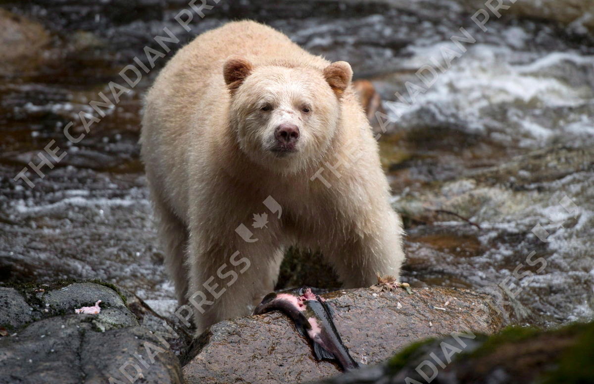 A Kermode bear, better know as the Spirit Bear is seen fishing in the Riordan River on Gribbell Island in the Great Bear Rainforest, B.C. Wednesday, Sept, 18, 2013. Following months of hearings, years of debate and dozens of protests, the federal panel reviewing the controversial Northern Gateway pipeline will release its report later Thursday. Much hangs in the balance. THE CANADIAN PRESS/Jonathan Hayward