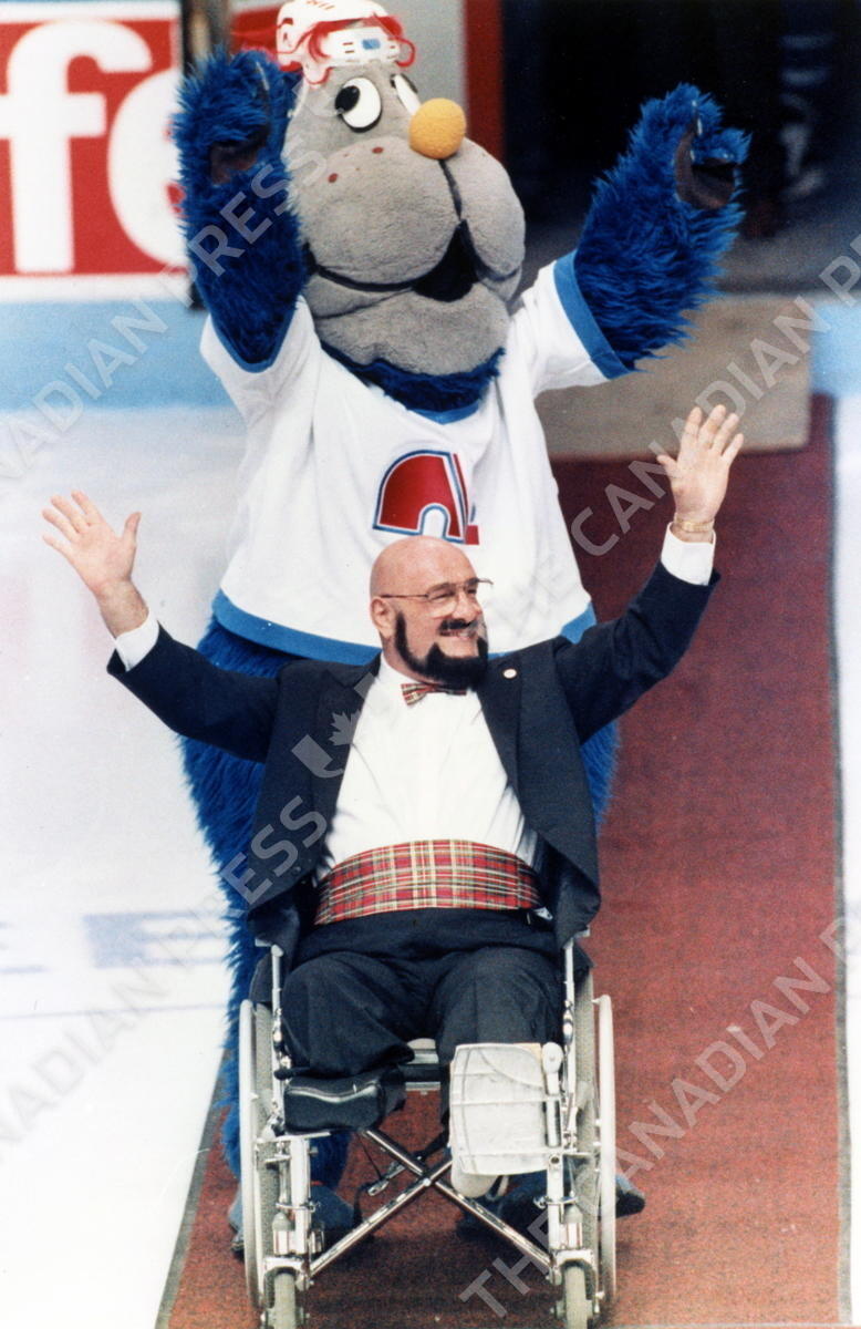 Former professional wrestler Maurice (Mad Dog) Vachon salutes the crowed after being wheeled in by Nordiques mascot Badaboum to receive a standing ovation from the crowd attending a hockey game, Quebec City, Feb. 29, 1988. Vachon lost a leg in 1987 after a car hit him. THE CANADIAN PRESS/Jacques Boissinot