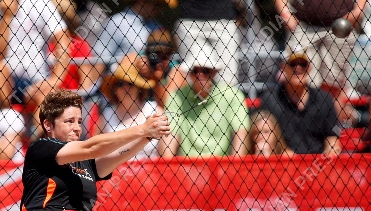 Heather Steacy competes in the hammer throw final at the Canadian Track and Field Championships in Calgary, Alta., Saturday, June 30, 2012. Siblings Jim and Heather Steacy of Lethbridge, Alta., are both members of Canada's track and field team at the London Olympics, the punctuation mark on two throwing careers spent practically side by side. THE CANADIAN PRESS/Jeff McIntosh