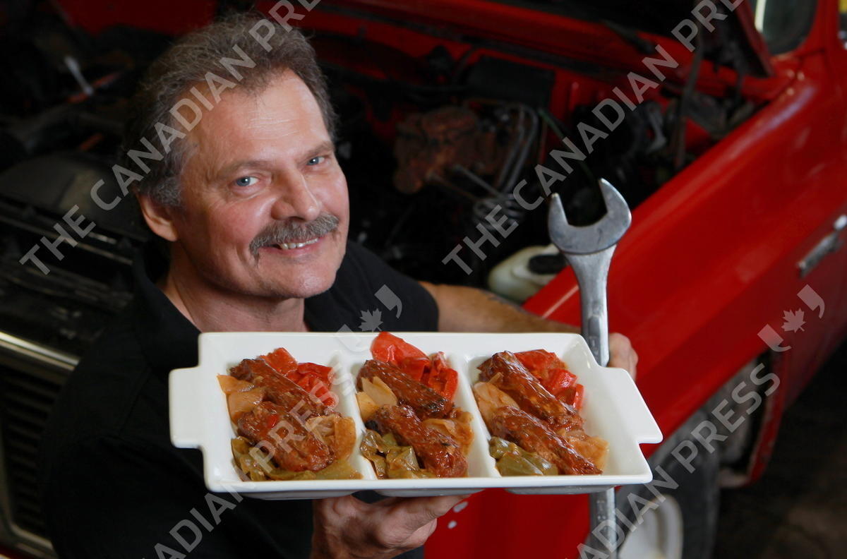 Truck mechanic Gary Fordham holds Pig Tails, one of his special recipes at his garage in Dorchester, Ont., on Friday, July 27, 2012. THE CANADIAN PRESS/Dave Chidley