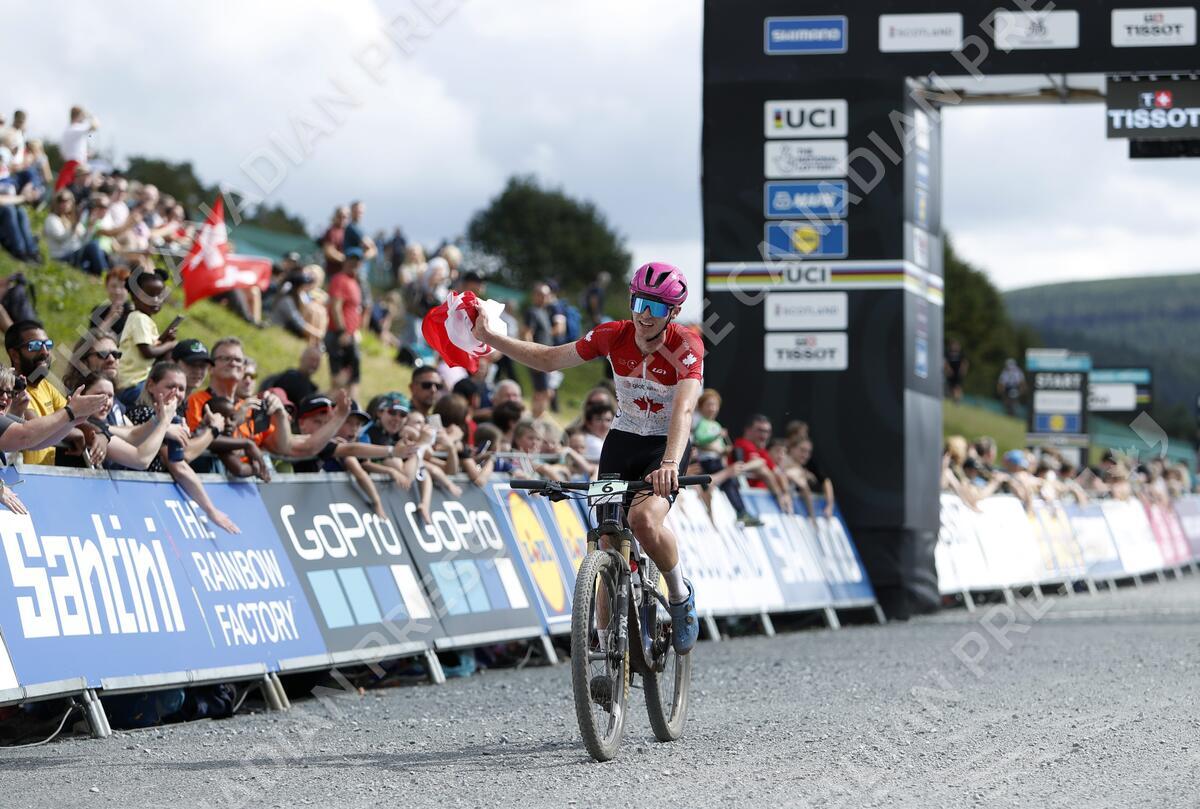 Canada's Ian Ackert crosses the finish line to take bronze in the Men's Junior Cross-Country Olympic race during day eight of the 2023 UCI Cycling World Championships at the the Glentress Mountain Bike Trail Centre, Peebles. Picture date: Thursday August 10, 2023.